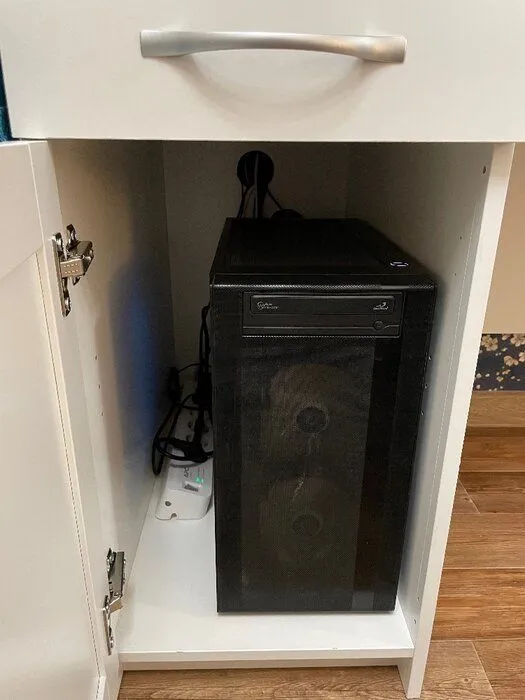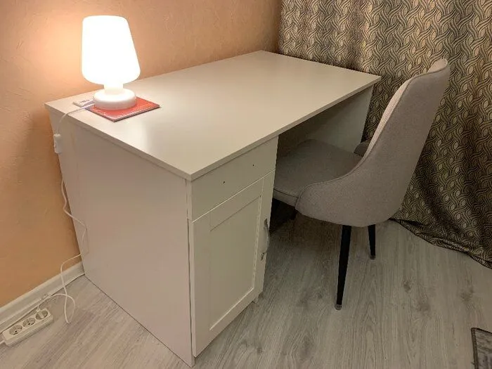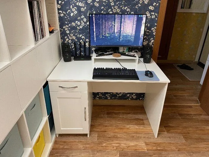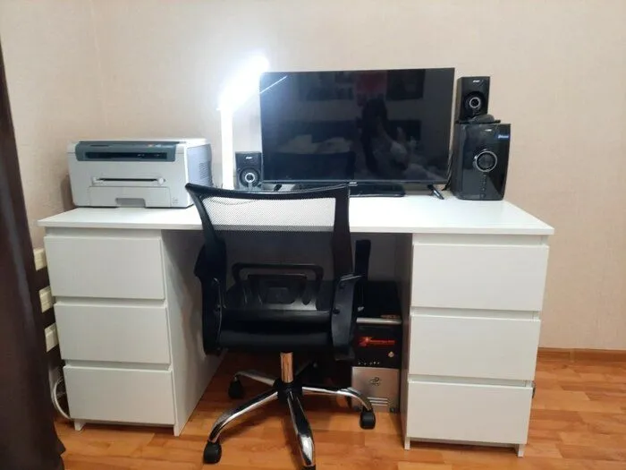 Отличный стол за свои деньги, приятное гладкое покрытие досок, возможность собрать тумбочку слева или справа. Искал именно такой стол по конструкции с большой тумбочкой и маленьким ящиком, задней стенкой, при этом небольшого размера столешницы. В тумбочке задняя стенка тоже толстая доска. На фото товара тумбочка справа, а в инструкции сборка только на левую тумбочку, но тут кому как повезет. Убрал полку из тумбочки и получилось отличное место для компьютера, просверлил в задней стенке отверстия для проводов и вентиляции. Но с закрытой дверцей пользоваться нельзя - компьютер слишком нагревается, но для меня это не проблема, главное все скрыто, когда не пользуешься.
