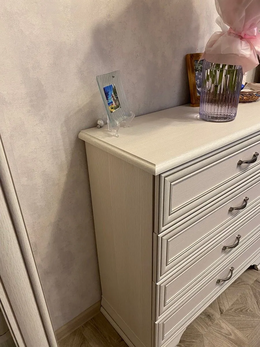 Нежный кремовый цвет вудлайн и отчетливая древесная текстура смотрится шикарно на фоне рамочно-филенчатых фасадов и заставляет любоваться внешним совершенством изделия. В нем гармонично все, от правильно подобранных размеров до внешнего покрытия. Матовая поверхность комода не сохраняет отпечатки пальцев и не создает бликов.