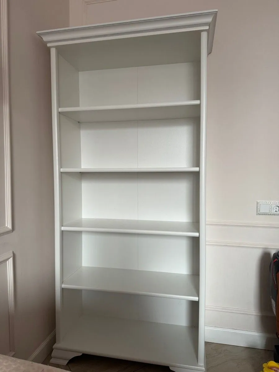 Белый стеллаж Kentaki – это открытая конструкция с комфортными размерами. Ее высота составляет 197,5 см, ширина 99,5 см и глубина 44 см. Стеллажный шкаф состоит из четырех отделений (полок), широких резных опор и фигурного карниза. В таком незатейливом виде он украсит интерьер кабинета, домашней библиотеки, детской и гостевой комнаты. Белый цвет фасадов, дополненный серебристой патиной, гармонично смотрится в обстановке классического и современного стиля.