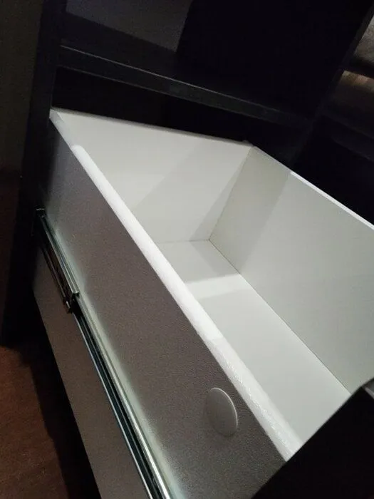 компактная с глубоким выдвижным ящиком. Собрали быстро, все отверстия совпали. соотношение цена-качество очень порадовало