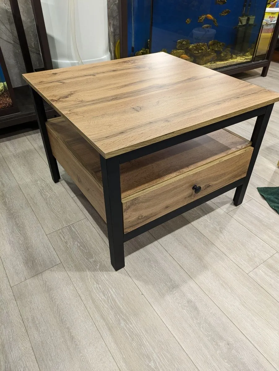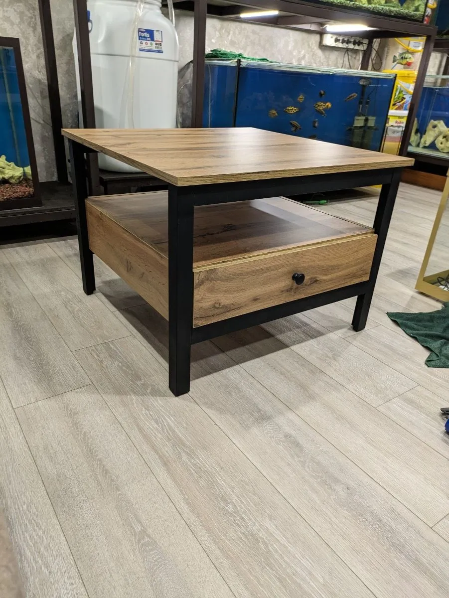 В журнальном столе Loft легкость и компактность гармонично переплелась с минималистичным дизайном и грубоватой фактурой. Эта миниатюрная модель квадратной формы размером 70×70 см не затруднит перемещению по комнате и впишется в самое маленькое пространство. Для комфортного использования она дополнена выдвижным ящиком, установленным на шариковых управляющих полного выдвижения. В него можно спрятать мелкие вещи, а саму столешницу использовать для чаепития, хранения пультов и прочих аксессуаров.