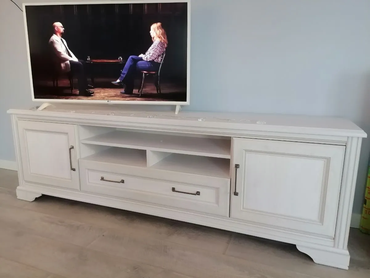 Это низкая (60,5 см), но длинная (194,5 см) модель глубиной 40 см станет отличной подставкой для ТВ с любой диагональю. С нее удобно будет смотреть передачи, как с пола, так и с дивана. Тумба под телевизор Stylius содержит 1 широкий ящик, 2 закрытых отделения с полками и 3 открытых блока для вспомогательной аппаратуры и дисков.
