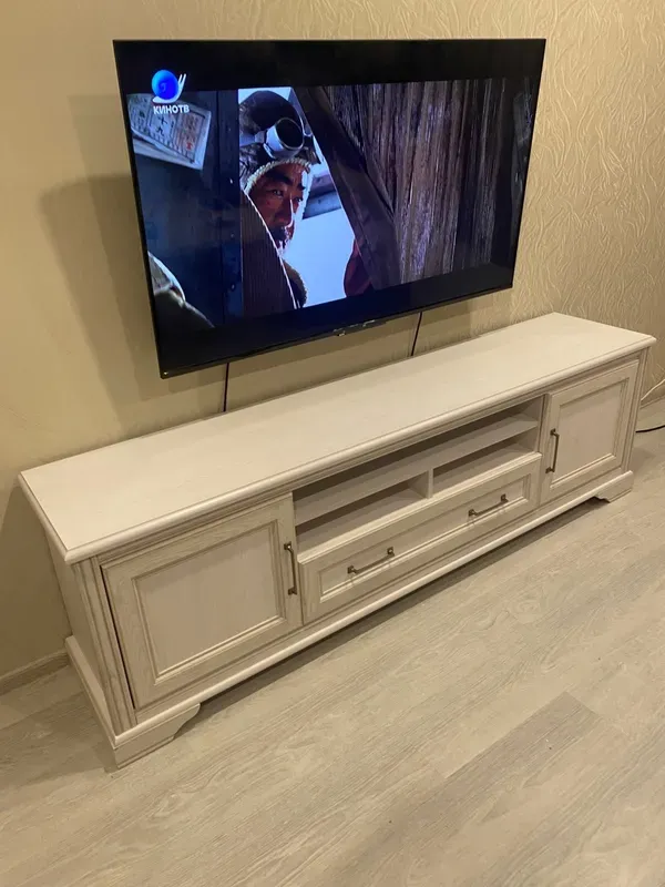 Дверцы и ящики свободно двигаются благодаря качественной фурнитуре из Европы. По своим функциям эта конструкция больше напоминает комод. На нее можно не только установить ТВ, но и хранить внутри диски, фотографии, документы. Закрытые полки надежно защитят предметы от пыли, проникновения влаги и помогут навести элементарный порядок.